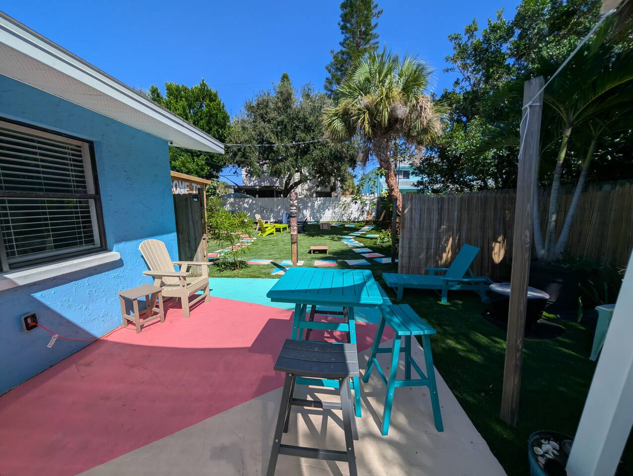 As a guest of Unit 2, you’ll enjoy direct access to the vibrant shared patio—one of the highlights of the property. This colorful outdoor space features sunshades, grills, and plenty of seating, making it perfect for morning coffee, an evening barbecue, or simply relaxing in the Florida sunshine. With only 11 guests across 4 units and more than 25 chairs spread across 11 seating areas, you’ll always find space to unwind. Inside your private studio, you’ll have everything you need for a comfortable stay, including a cozy living space, kitchenette, and bathroom. We live nearby and personally maintain the property. While we respect your privacy, we’re close at hand if you need anything during your stay. Parking: One free parking spot is included with this unit.