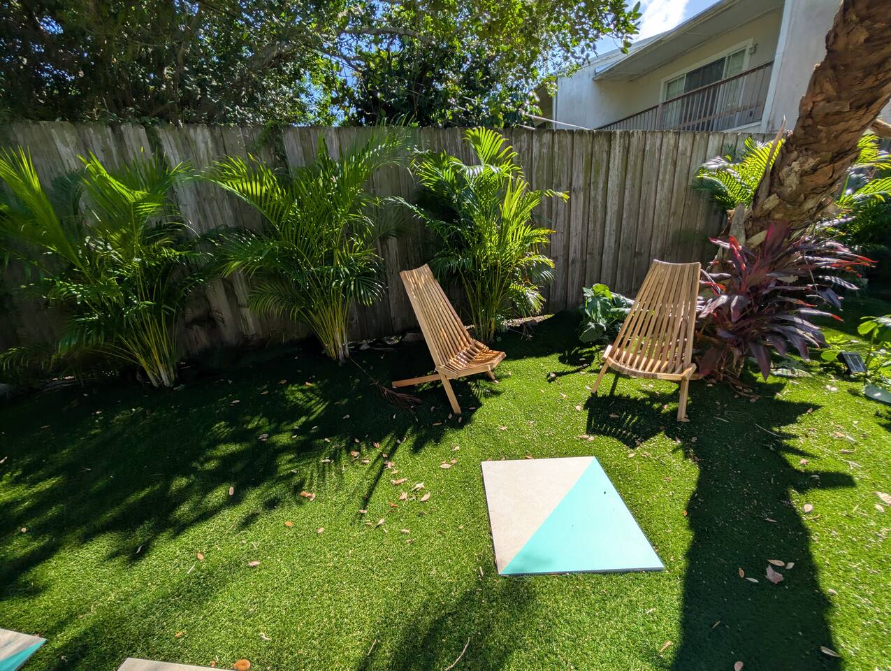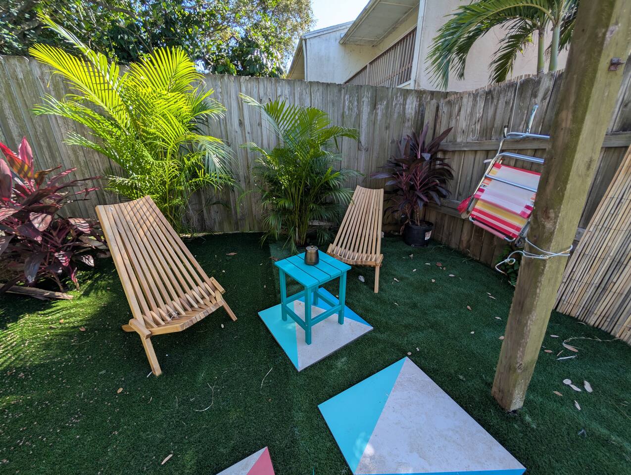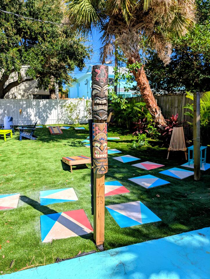 The Main House is the largest accommodation in our boutique quadplex, offering a spacious and comfortable retreat just steps from Cocoa Beach. Wake up to ocean breezes, walk to the sand in minutes, or head downtown to enjoy local restaurants, shops, and attractions—all within easy walking distance. Unlike the other units, this 2-bedroom, 1-bathroom home includes a full kitchen, perfect for preparing meals after a day at the beach. The inviting living area is ideal for unwinding, and the private in-unit arcade adds a unique touch of fun for guests of all ages. Guests of the Main House also enjoy the best of both worlds: a dedicated seating area reserved for your group plus access to a shared resort-style backyard. With 25+ chairs and 11 unique seating zones, there’s always a private corner to relax. Colorful patios, grills, and open seating make it easy to gather for meals, games, or quiet moments under the sunshades. The property is pet-friendly, with clear guidelines in place to ensure a respectful and enjoyable stay for all. With its spacious layout, private amenities, unbeatable location, and the balance of shared and personal outdoor space, the Main House offers a resort feel without the resort crowds—a memorable Cocoa Beach escape for families and groups alike.